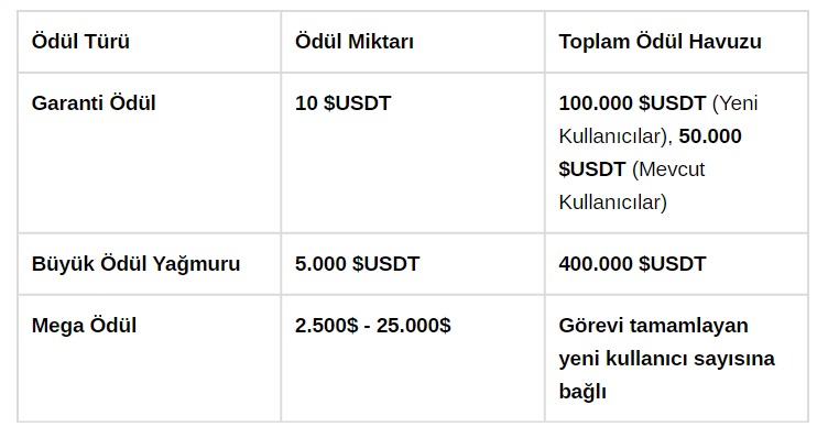 Her davet ettiğiniz ve görevi tamamlayan arkadaşınız için 5 $USDT kazanabilirsiniz. Yeni kullanıcılar için garanti ödül havuzu 100.000 $USDT, mevcut kullanıcılar için ise 50.000 $USDT’dir. Ödül havuzu dolmadan görevleri tamamlayarak garanti ödüllerden faydalanabilirsiniz.